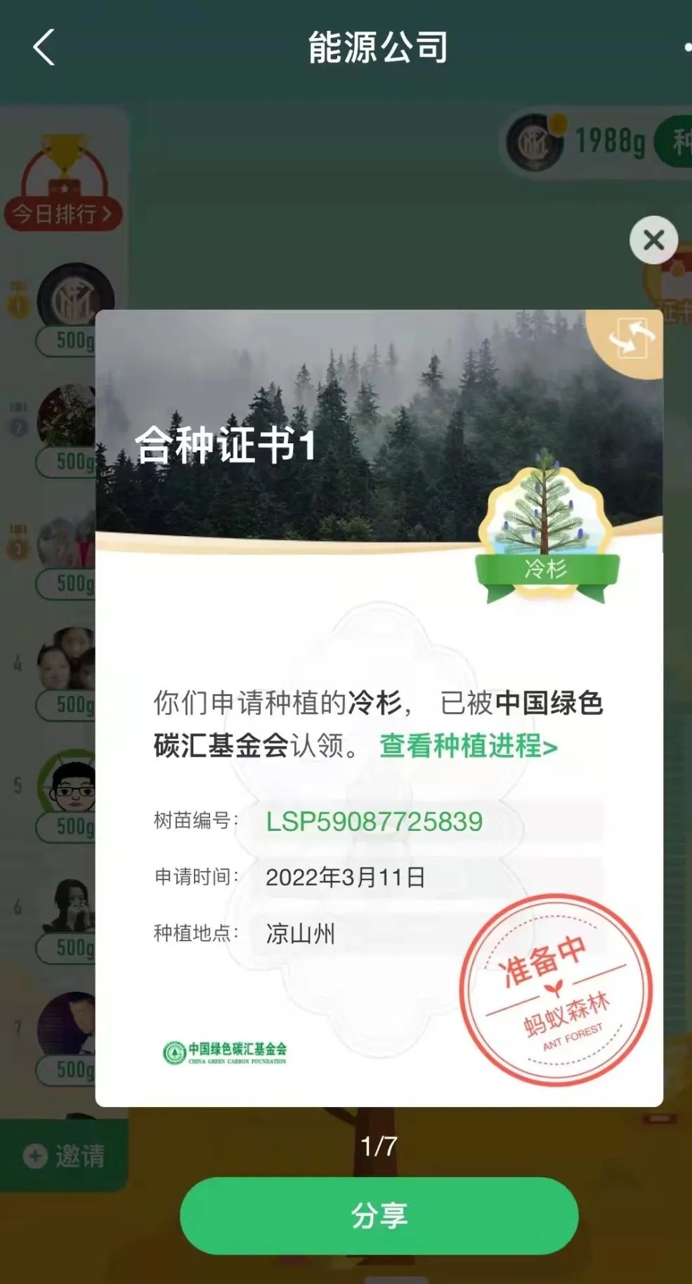 “一花一草皆生命,一枝一葉總關(guān)情?!痹缭?019年起,公司就通過支付寶螞蟻森林組建了一只“能源公司云種樹小隊(duì)”,如今隊(duì)伍人數(shù)越來越壯大,已有59位隊(duì)員,截止目前,在酒泉、大理、邯鄲等地,種下了冷杉、側(cè)柏、云杉、胡楊等7棵大樹。3月11日,在小伙伴的共同努力下,我們又種下了一棵冷杉樹,該樹被中國綠色碳匯基金會認(rèn)領(lǐng),將種植到?jīng)錾街莸貐^(qū)。